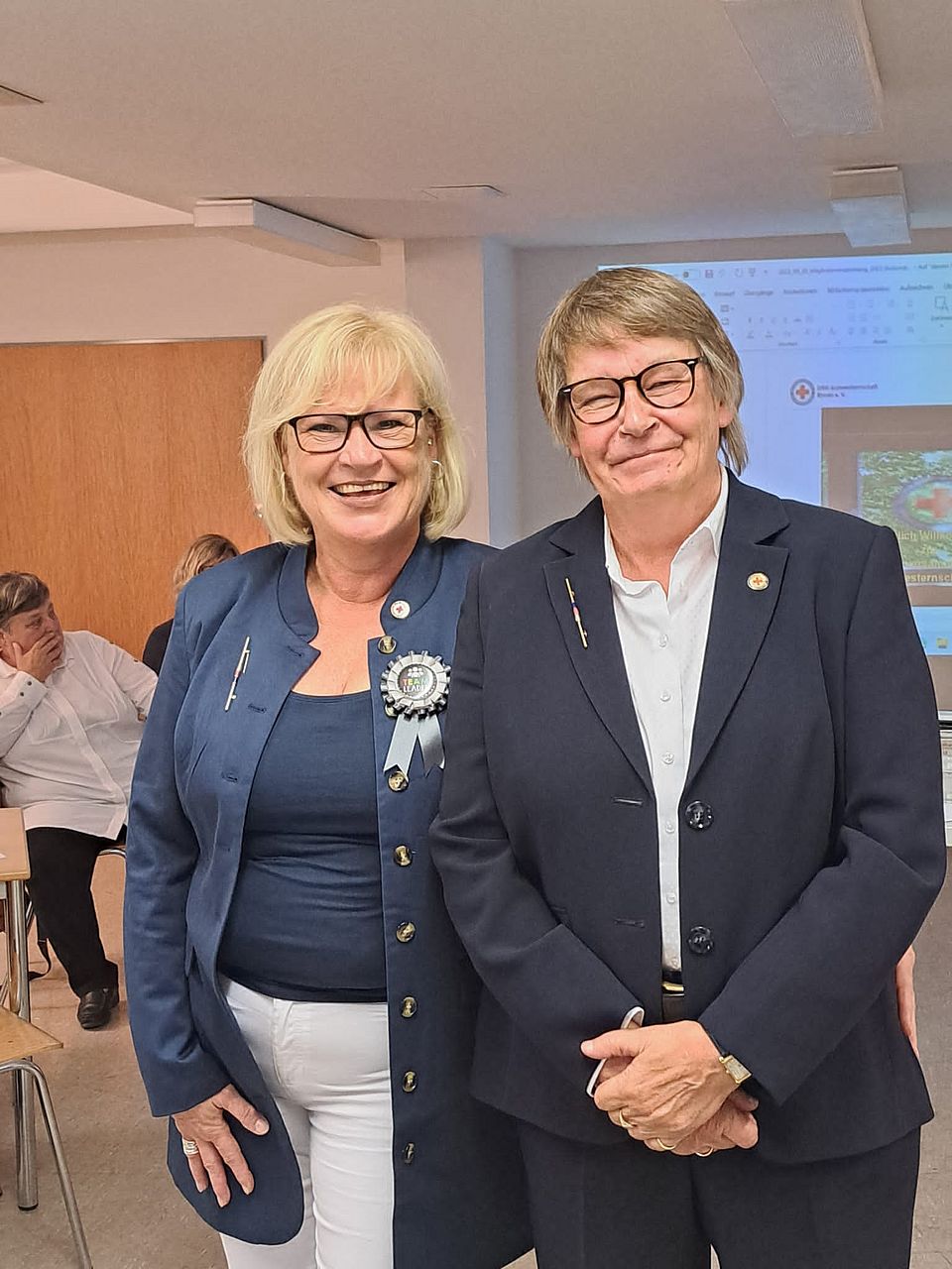 Die Präsidentin des Verbandes der Schwesternschaften vom DRK e.V., Generaloberin Gabriele Müller-Stutzer (rechts im Bild) gratulierte Oberin Rehmann herzlich zur Wahl und überreichte ihr die Oberinnnadel. Oberin Anja Rehmann ist ebenfalls Oberin der DRK-Schwesternschaft Westfalen in Gelsenkirchen.